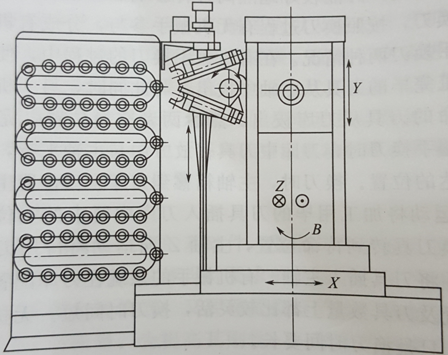 小型加工中心使用的另一種圓盤(pán)刀庫(kù),圓盤(pán)式刀庫(kù)刀具常見(jiàn)的容量是16到24把刀,刀具數(shù)量相對(duì)于斗笠式刀庫(kù)多一些。圓盤(pán)式刀庫(kù)得換刀時(shí)間比較短,一般只需要4s就能完成換刀過(guò)程,相對(duì)于斗笠式刀庫(kù)換刀時(shí)間縮短了一倍。我們正工數(shù)控的VMC650小型加工中心,使用的就是圓盤(pán)式刀庫(kù),刀具數(shù)量標(biāo)配為16把。有些把圓盤(pán)式轉(zhuǎn)變?yōu)殒準(zhǔn)降稁?kù),刀具可存幾十把或者上百把,但是這種刀庫(kù)并不適用于小型加工中心。【如下圖所示鏈?zhǔn)降稁?kù)】