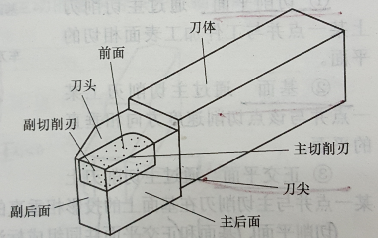 通過上圖所示可以看出數(shù)控車床的外圓車刀是最基本、最典型的切削刀具,其切削部分(又稱刀頭)由前面、主后面、副后面、主切削刃、副切削刃和刀尖所組成。