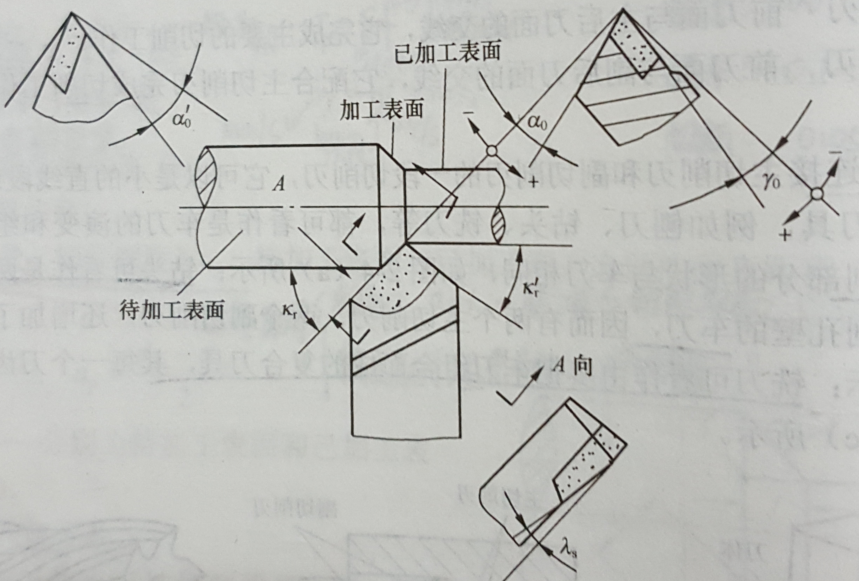 在正交平面內(nèi)測(cè)量的前刀面與基面之間的夾角,前角表示前刀面的傾斜程度,有正、負(fù)和零指之分,正負(fù)規(guī)定如圖中所示。