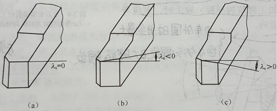 在切削平面內(nèi)測(cè)量的主切削刃與基面之間的夾角。當(dāng)主切削刃呈水平時(shí),λs=0;當(dāng)?shù)都鉃橹髑邢魅猩献畹忘c(diǎn)時(shí),λs<0;當(dāng)?shù)都鉃橹髑邢魅猩献罡唿c(diǎn)時(shí),λs>0【如下圖所示】