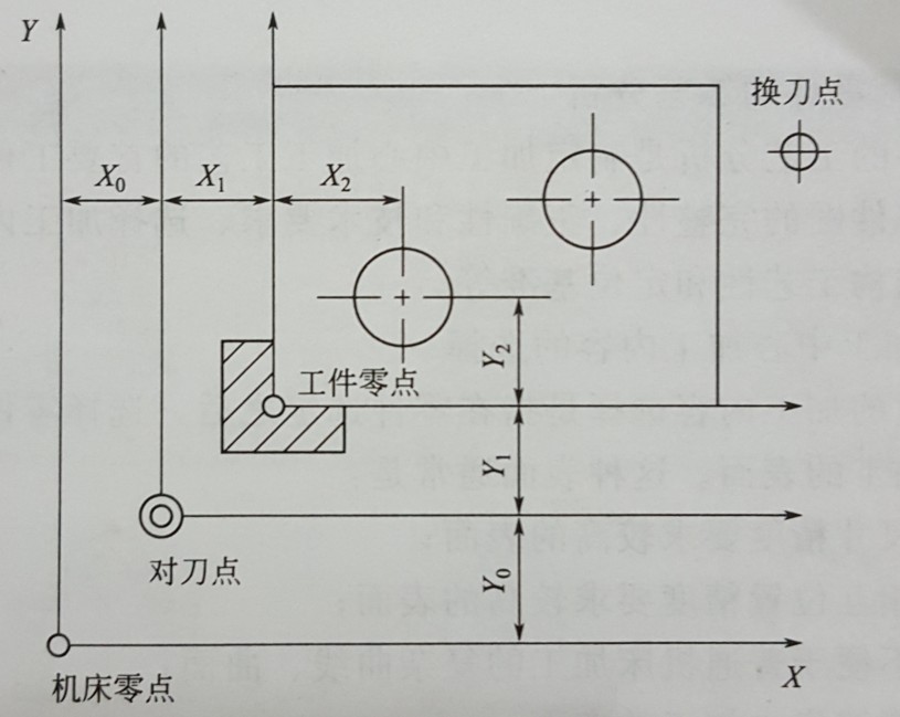 對刀點可選在工件上,也可選在工件外面(如選在夾具上或機床上),但必須與零件的定位基準有一定的尺寸關系,【如下圖所示】圖中的X0和Y0,這樣才能確定機床坐標系與工件坐標系的關系。