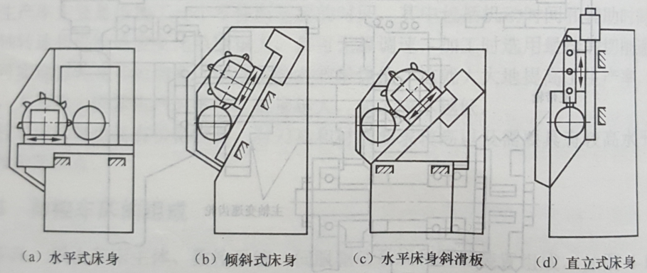 數(shù)控車床的床身結(jié)構(gòu)和導(dǎo)軌有很多種形式,主要有水平式床身、傾斜式床身、水平床身斜滑板以及直立式床身等,其各種布局形式【如下圖所示】