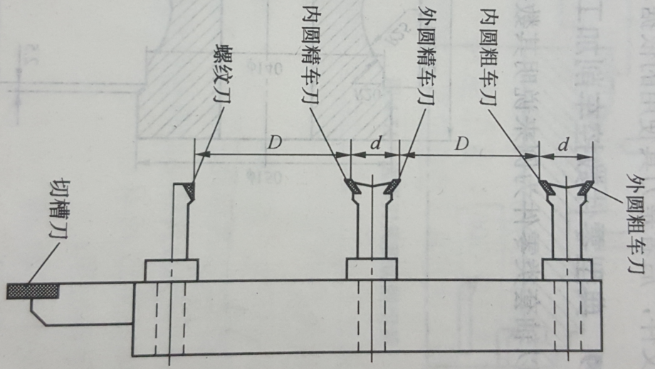 從上圖可以看出數(shù)控車床的內(nèi)、外圓車刀是背靠背并列在一起的,刀具的距離d應(yīng)等于或小于管材毛坯內(nèi)徑。這樣排列刀具的目的是為了保持?jǐn)?shù)控車床在加工過(guò)程中主軸始終朝一個(gè)方向轉(zhuǎn)動(dòng),避免主軸反轉(zhuǎn);內(nèi)圓粗車刀與外圓精車刀之間的距離D應(yīng)大于管材毛坯的內(nèi)外半徑之差。在使用排刀法時(shí),程序與刀具的位置有關(guān)。