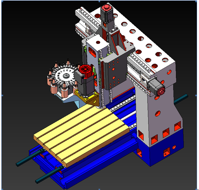 該型號數(shù)控機(jī)床總體布局龍門框架底座固定式結(jié)構(gòu),工作臺在底座上作X向移動;立柱固定在底座兩端,主軸箱在立柱上的橫梁作Z向上下移動。